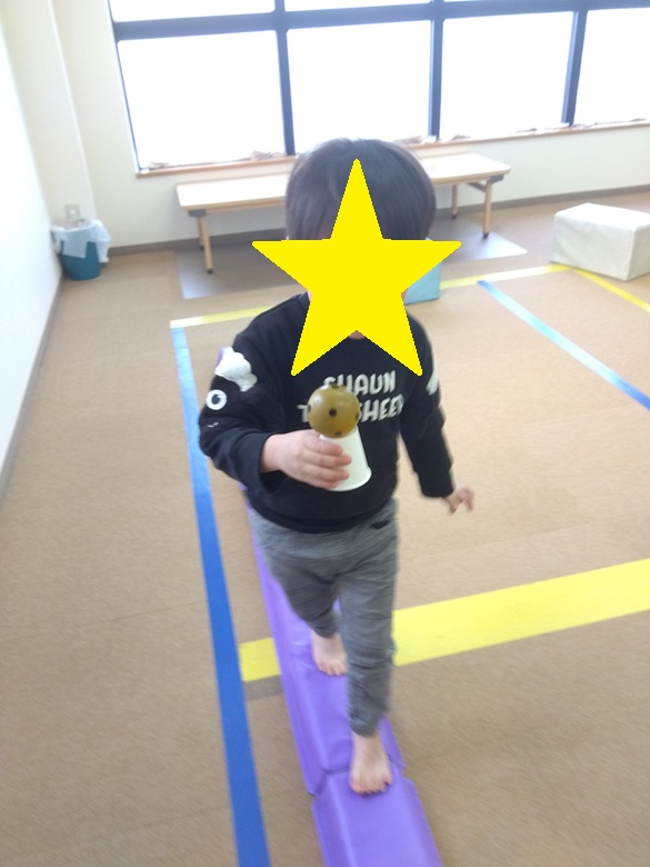 ボール運びでは、逆さまにした紙コップの上にボールをのせて歩きながら、平均台の上を歩いたり、クッションブロックをまたいで進んでいきます!