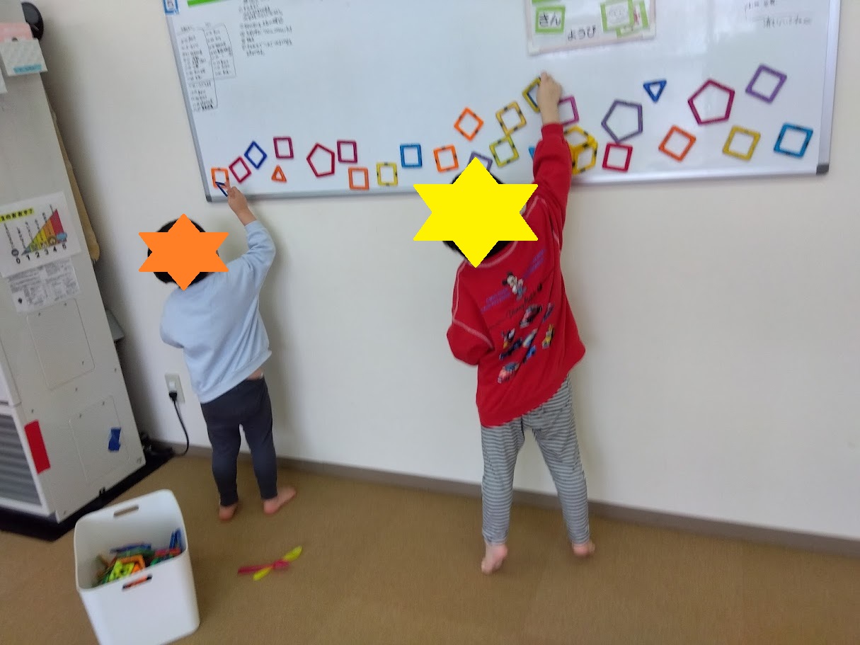 そのおもちゃがどこにくっつけることが出来るのか探していて、ホワイトボードにくっつけることに気が付き、いっぱい付けようとして、背伸びをして頑張っています💪