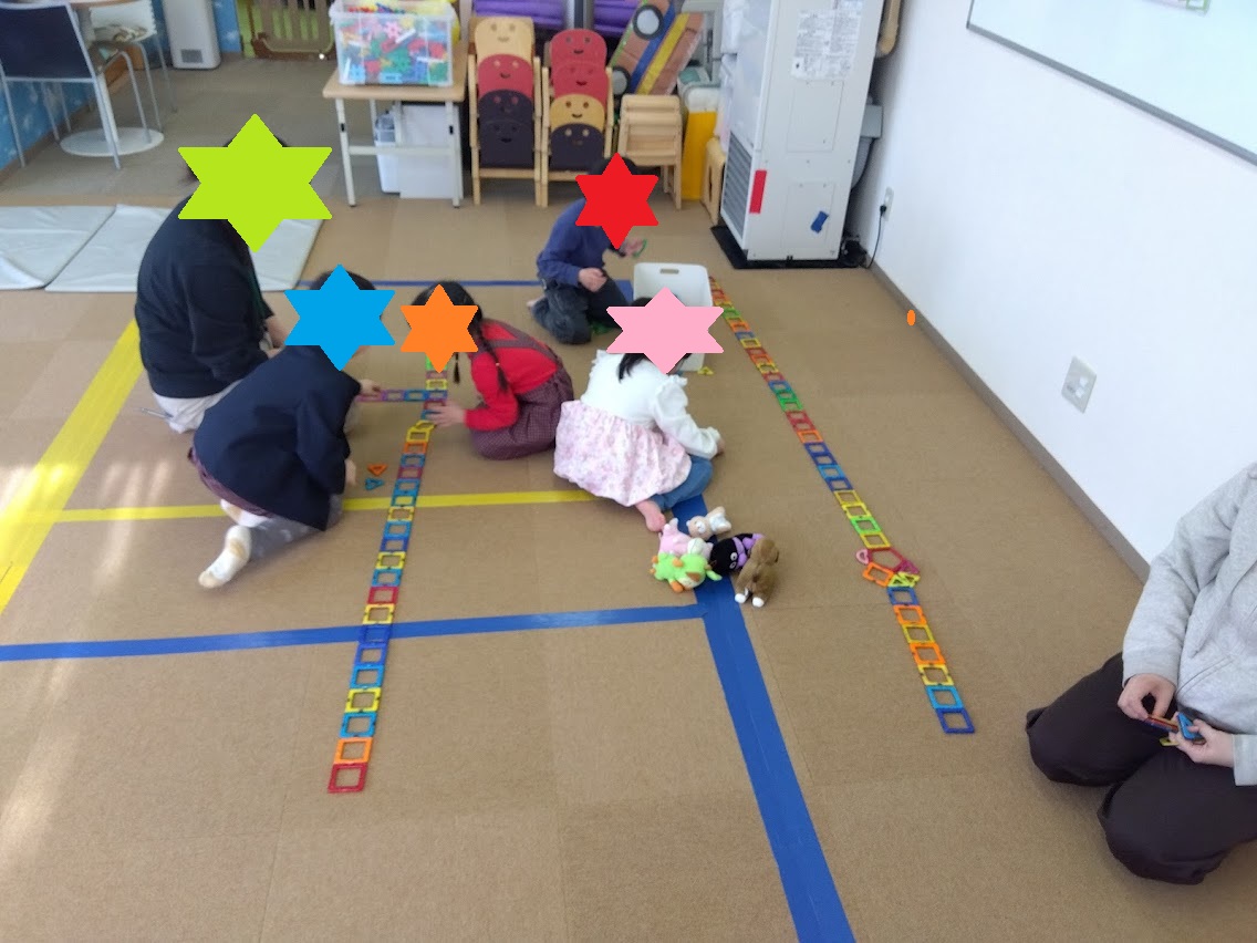 きっずにはプラスチック製のワミーというおもちゃがあります。小さい穴にパチンとくっつけて細かい作業になっています。ですが集中して長く繋げていました👍