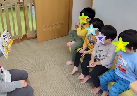 絵本を見ている時、みんな真剣な表情だったり、場面によっては絵のお菓子を食べたりと、楽しみ方はいろいろです💓