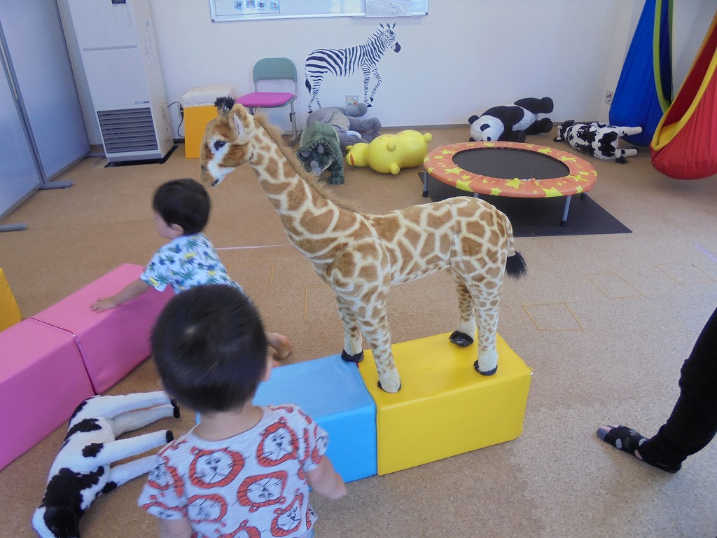 乗れるきりんさんをブロックの上にのせて遊んでいるようです。