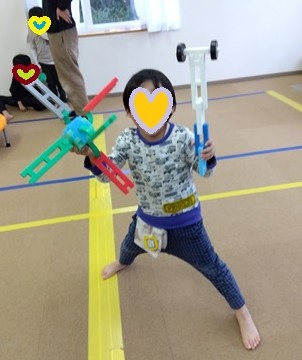 この日は大きな武器を作り職員に戦いを挑んできました。