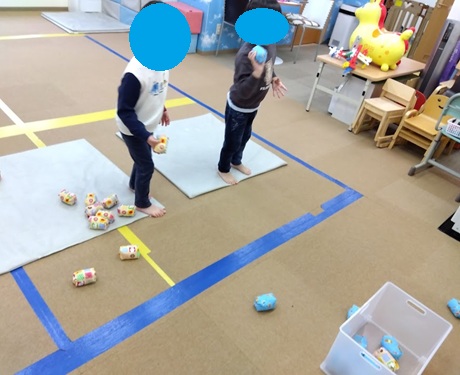 年齢によって箱の位置を近づけたり、遠ざけたりして難易度を調節しながら行っていますよ☺️