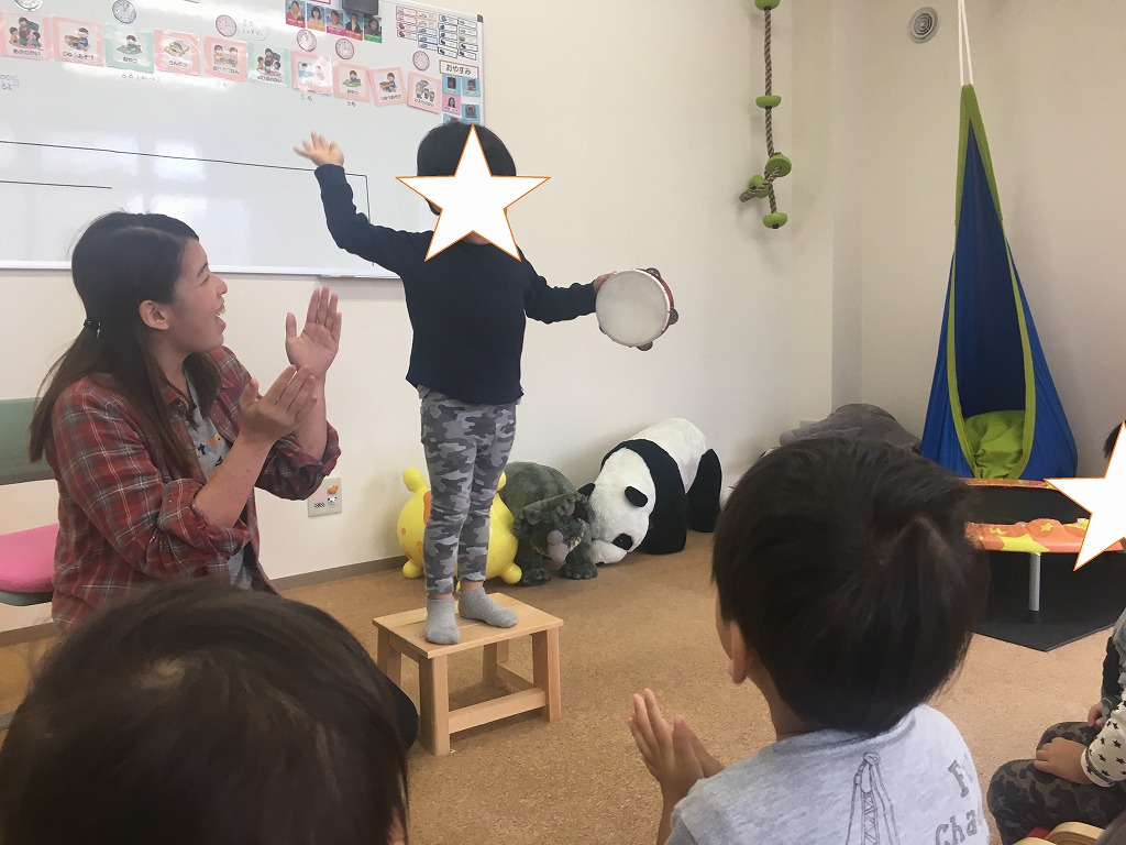 リズムに合わせてタンバリンをたたいたり、鈴を鳴らしたり♪