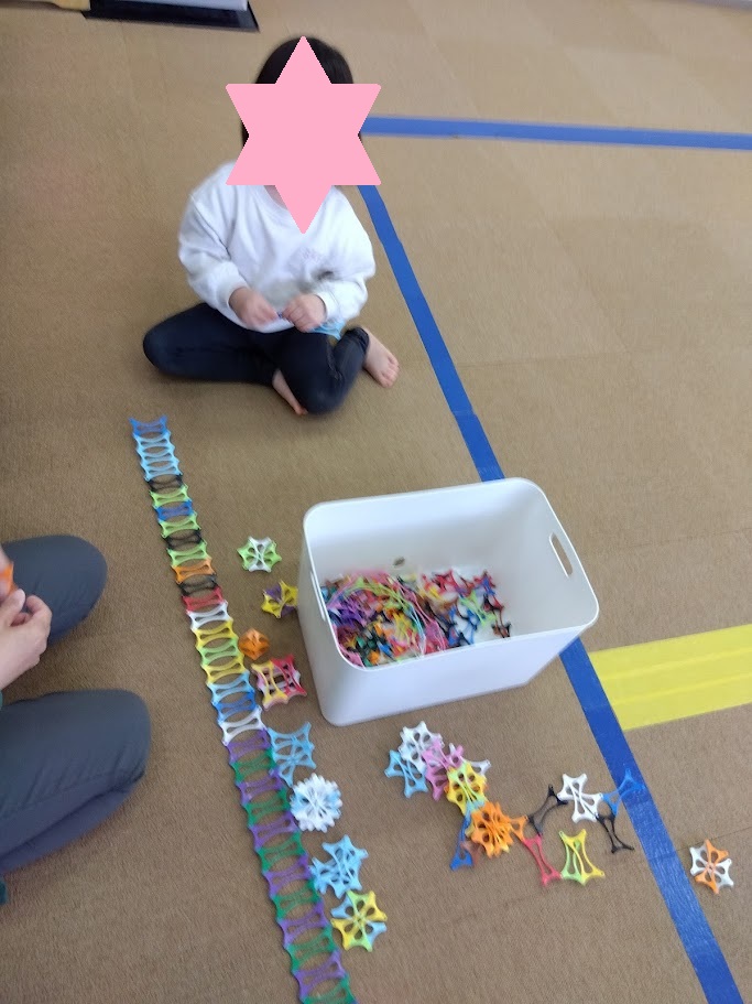 きっずにはプラスチック製のワミーというおもちゃがあります。小さい穴にパチンとくっつけて細かい作業になっています。ですが集中して長く繋げていました👍
