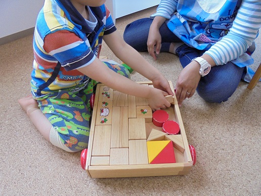 全部出して組み立てたり積み上げたりとっても楽しく遊んでいますが、実はお片づけが難しいんです。上手に当てはめないと全部入らなかったり、形が合わなかったり…