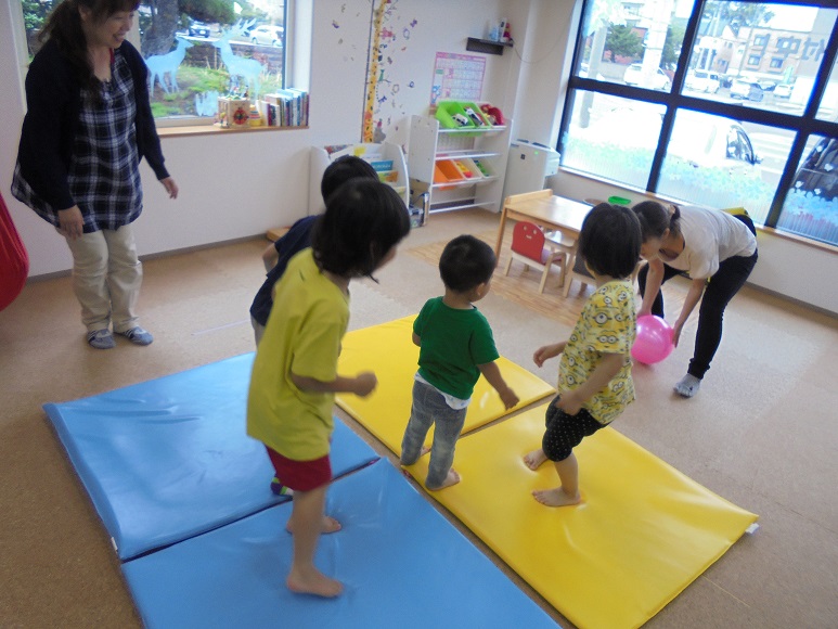 一番上は年長さんで一番下は2歳児さんが同じ遊びに参加しています。