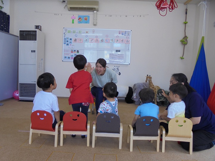 活動は発達や年齢に分けて行いますが、まずは全員で朝の会からスタートです。