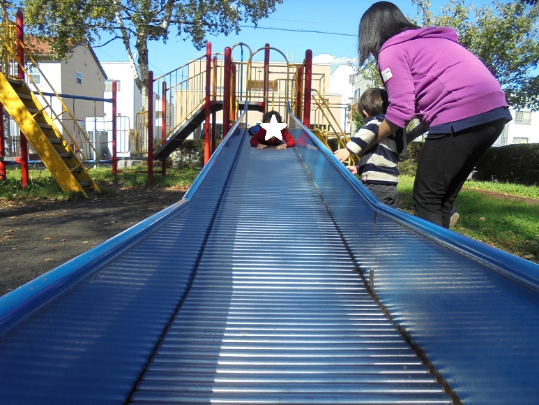 ゆるやかでゆっくりな傾斜の滑り台で、一人スーパーマン滑りをすると