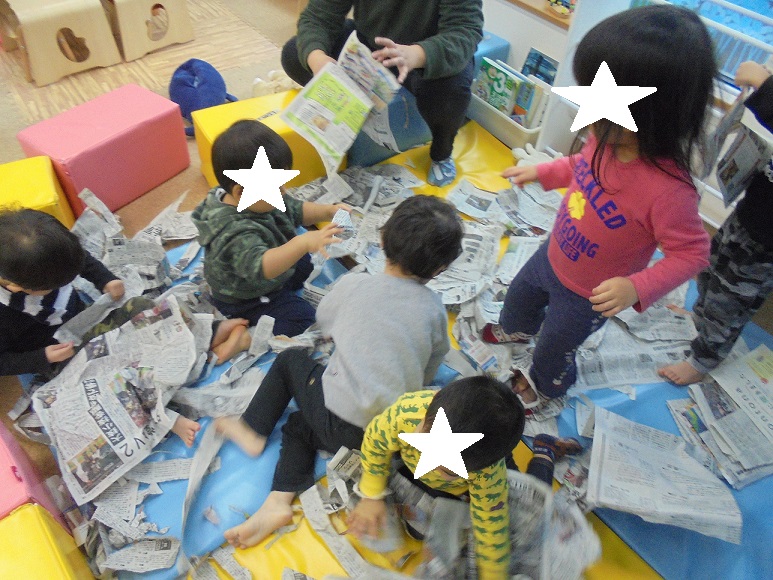 今日はみんなで新聞紙で遊びました!